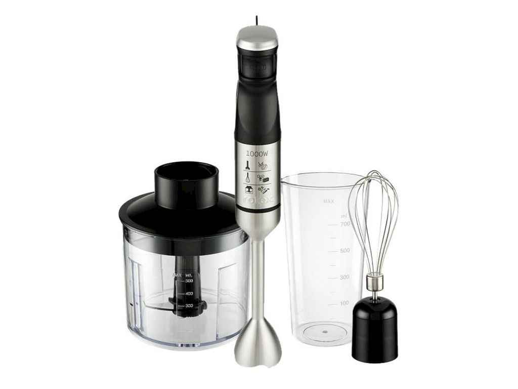 Потужність 1000 W. Плавне регулювання швидкості. Ніж з нержавіючої сталі Ice Crush з титановим покриттям . Пластиковий корпус зі знімною ногою. Нога з нержавіючої сталі. Петля для підвішування. Аксесуари: чаша з подрібнювачем 500 мл, мірний стакан: 700 мл, віночок. Колір: чорний. Гарантія - 1 рік.