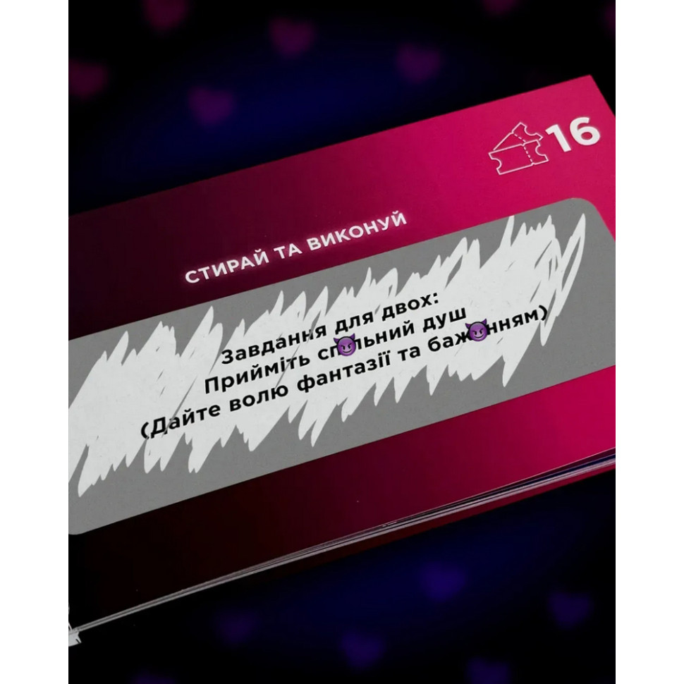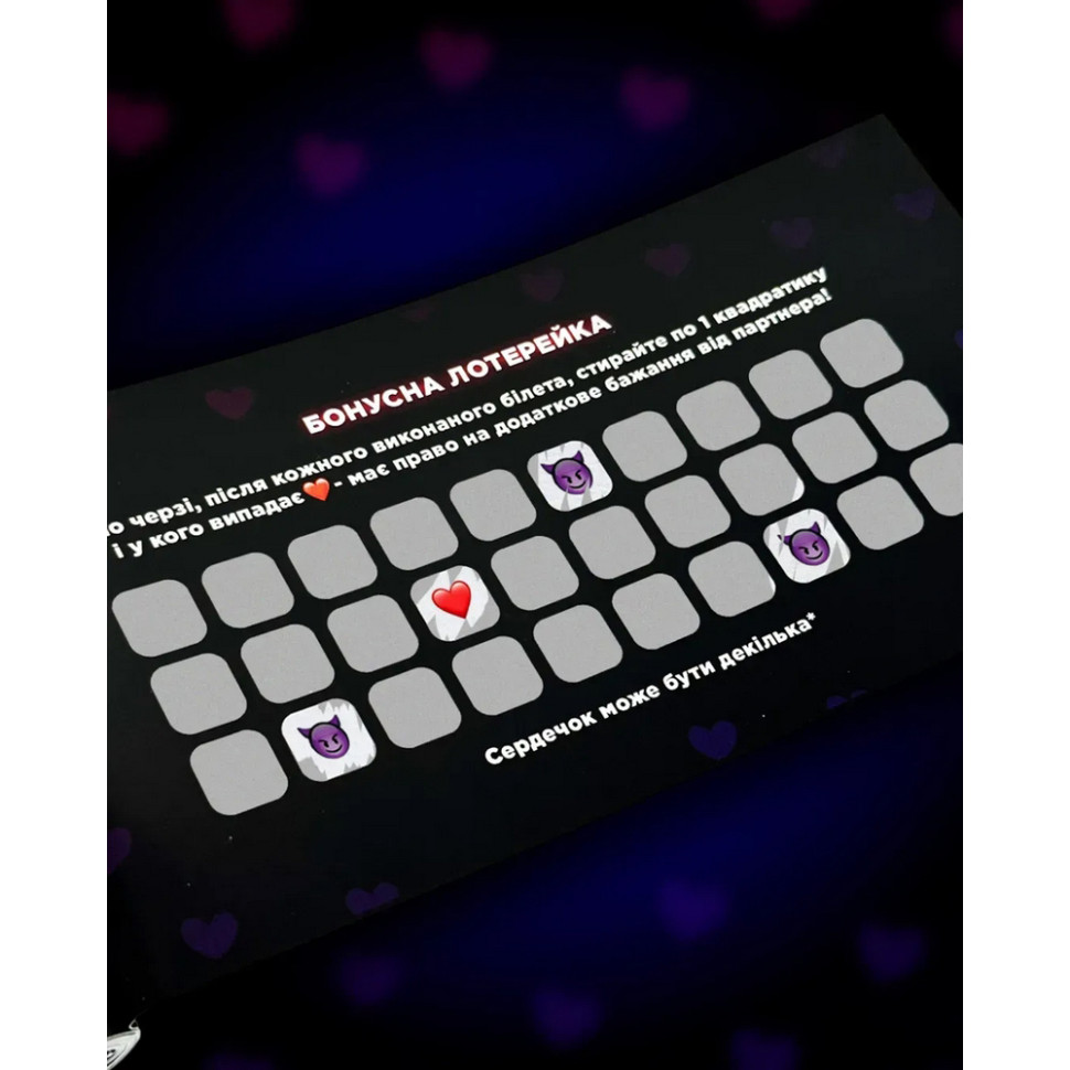 Добавьте азарта в вашу интимную жизнь«Интимная лотерейка: Для двоих»это 30 билетов, которые вам нужно оторвать, соскрести с них скретч-покрытие и выполнить самые интимные заданияИ самое главное: никогда не знаешь, кто именно сегодня выиграетА также мы подарили вам бонусную лотерейку на последней странице