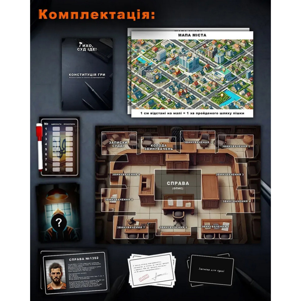 Настольная игра «Тихо, суд идет!»это настоящее судебное заседание, в котором вы будете выступать в роли адвоката, судьи или прокурора. В ваших руках судьба подозреваемых, поэтому нужно убедить судью либо в невиновности подсудимого, либо доказать его вину. Игра рассчитана на компанию друзей от 14 лет.Начало судебного процесса: определение ролейПеред началом партии нужно выбрать одно из трех дел. На этом этапе вы знакомитесь с сутью дела и подсудимым, которого будете защищать или же обвинять.После этого тайно получаете роль одного из участников судебного процесса или же договариваетесь о своей роли с другими игроками.Если вы:– адвокат, то должны защитить подсудимого;– прокурордолжны собрать доказательства против подозреваемого, чтобы доказать его вину;– судьяваша задачавнимательно слушать доказательства, аргументацию по делу и вынести окончательный приговор.Как повлиять на приговор судьиВо время суда в игре вы собираете ряд доказательств, чтобы спасти или обвинить подсудимого. Для этого вам нужно:- тщательно анализировать доказательства,- использовать критическое мышление,- пытаться применить полученные данные в свою пользу.Также в процессе вы сможете использовать карту и проверять расстояния и время, за которое их можно преодолеть, для подтверждения или опровержения фактов.Во время процесса судью можно склонить на свою сторону не только благодаря логике и доказательствам, но пойдете ли вы на это?«Тихо, суд идет!»настольная игра для 5–9 друзей, в которой вам нужно доказать свою точку зрения и убедить в ней судью. Игра интересна тем, что в ней нет неопровержимых доказательств, поэтому здесь есть место манипуляции и риторике. Настольная игра требует от игроков социального взаимодействия и учит правильно выражать мнение.Если же вам интересно раскрывать запутанные преступления, тогда обратите внимание на серию игр «Итальянские расследования», в ней вы будете не только помогать распутывать дело, но и играть роль одного из подозреваемых.Содержимое игры:– коробка;– игровое поле;– 9 карт города;– 48 карточек улик;– протокол судьи;– фломастер;– правила.