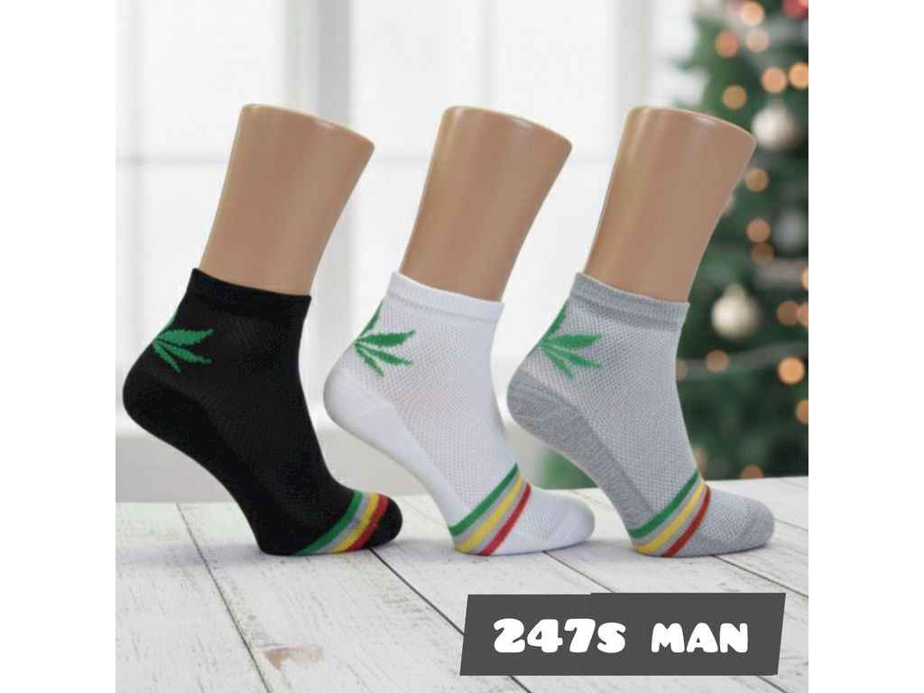Дизайн виконаний у стилі раста: на п’яті розміщений декоративний малюнок листка коноплі як символ натуральності, а на носку — три смужки зеленого, жовтого та червоного кольорів. Такий дизайн робить шкарпетки стильним акцентом повсякденного образу.