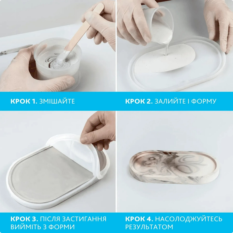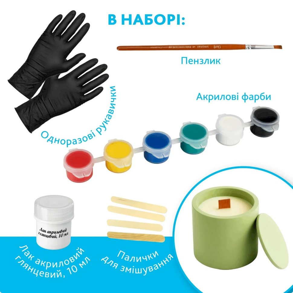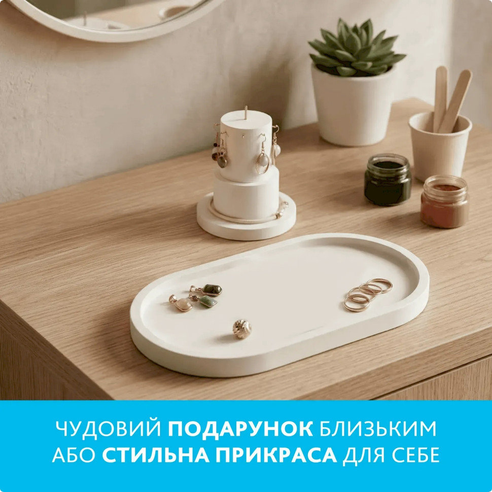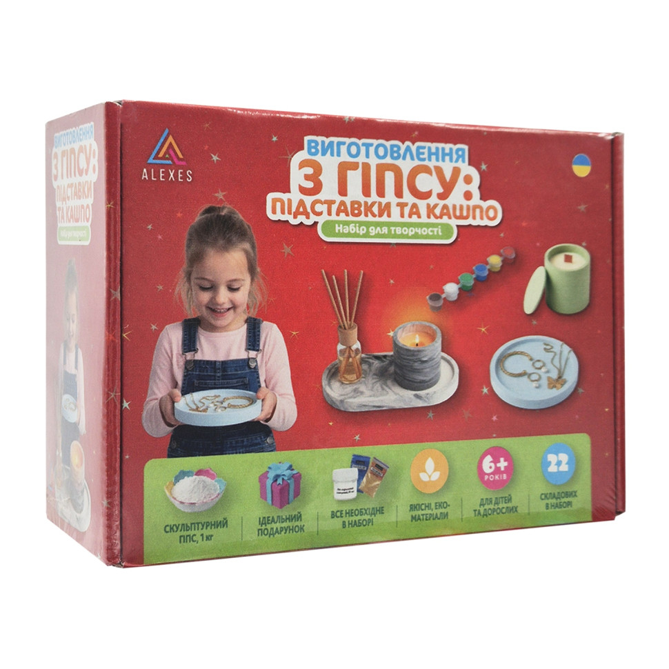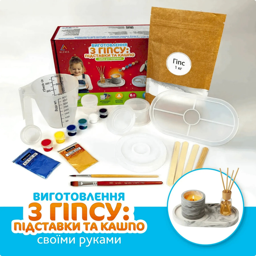 Набор для изготовления подставок и кашпо из гипсаОписание товара:Творческий набор станет отличным выбором для тех, кто хочет производить стильные гипсовые изделия собственноручно. В комплекте есть все необходимое для изготовления красивых и практичных элементов декора: подсвечек, кашпо для растений, декоративных тарелочек или органайзеров для украшений.Набор подходит как для начинающих, так и для тех, кто уже увлекается творчеством. Благодаря красителям и акриловым краскам можно экспериментировать с цветами, создавать оригинальные оттенки и декоративные эффекты, придающие изделиям особый характер.Преимущества набора:полный комплект материалов для творчестваподходит для домашнего досуга и подаркапростой и удобный в использованиидает возможность создавать стильные декоративные изделия своими рукамиСостав набора:гипс скульптурный - 1 кгперламутровый краситель для гипса - 2 шт.набор акриловых красок - 6 шт.силиконовая форма «Кашпо»силиконовая форма «Подставка круг»силиконовая форма «Подставка овал»мерный пластиковый стакан - 500 млмерный черпак для порошка - 70 млодноразовые перчатки - 1 парапалочки для смешивания - 4 штакриловый глянцевый лак - 10 мл.кисточки - 2 штИнструкция по использованию:Подготовьте рабочее место, застелив поверхность защитной пленкой. В мерном стакане смешайте гипс с водой в пропорции примерно 100 г гипса на 35-40 мл воды. По желанию добавьте перламутровый краситель или чуть-чуть акриловой краски для получения желаемого оттенка. Тщательно перемешайте смесь до однородной консистенции без комочков. Аккуратно залейте в силиконовую форму и оставьте застывать на 30-60 минут. Для полного высыхания изделия потребуется 12-24 часа. После этого осторожно извлеките готовое изделие из формы. При желании украсьте его красками или покройте глянцевым лаком для блеска и дополнительной защиты. В результате вы получите стильное кашпо или подставку, созданную собственноручно.