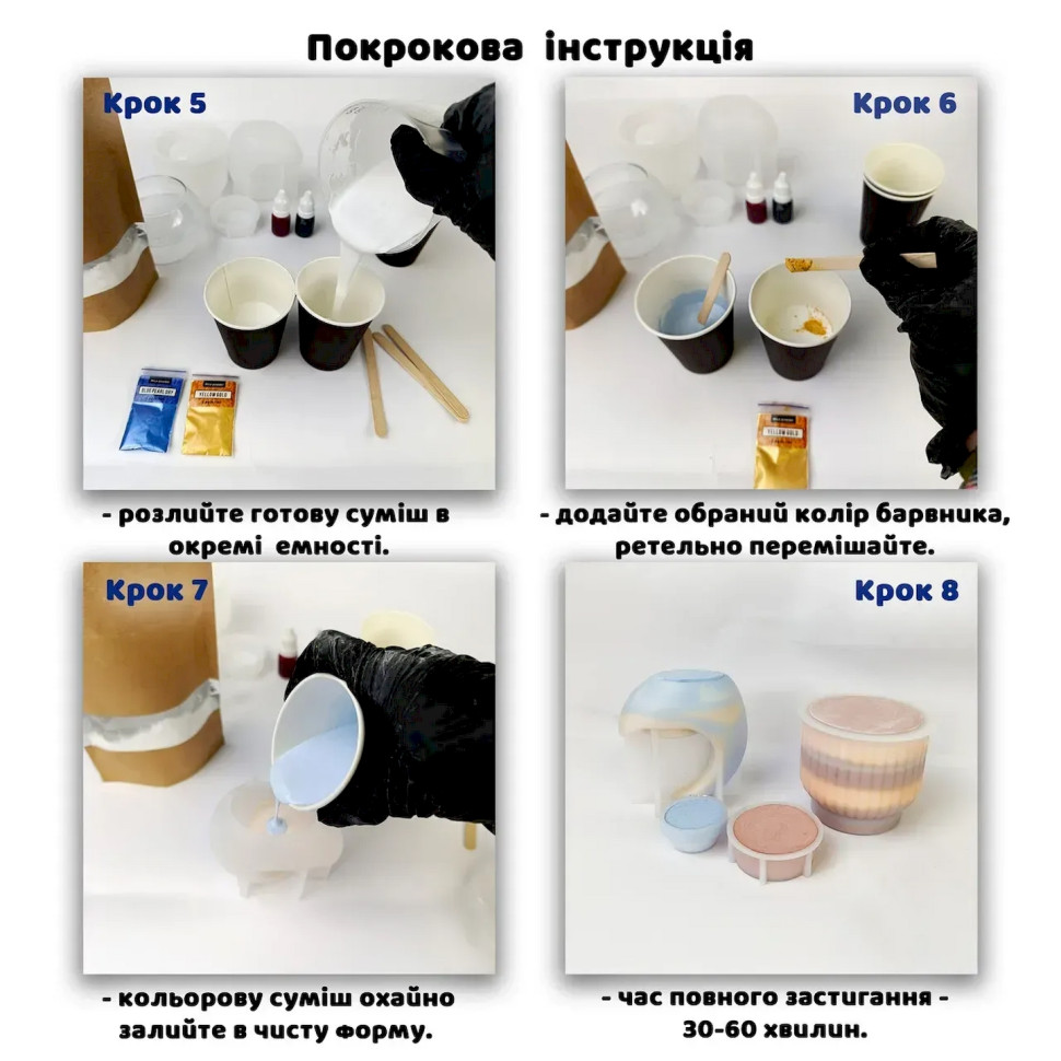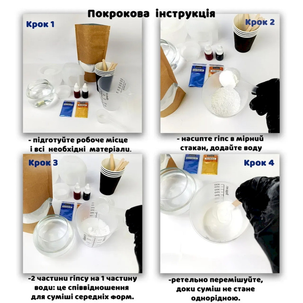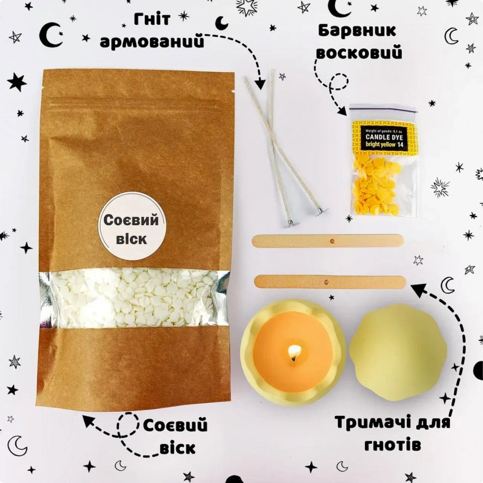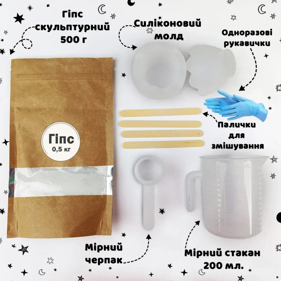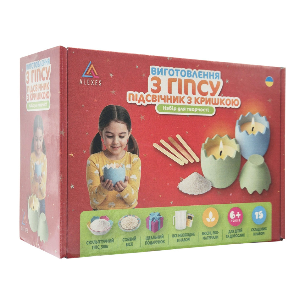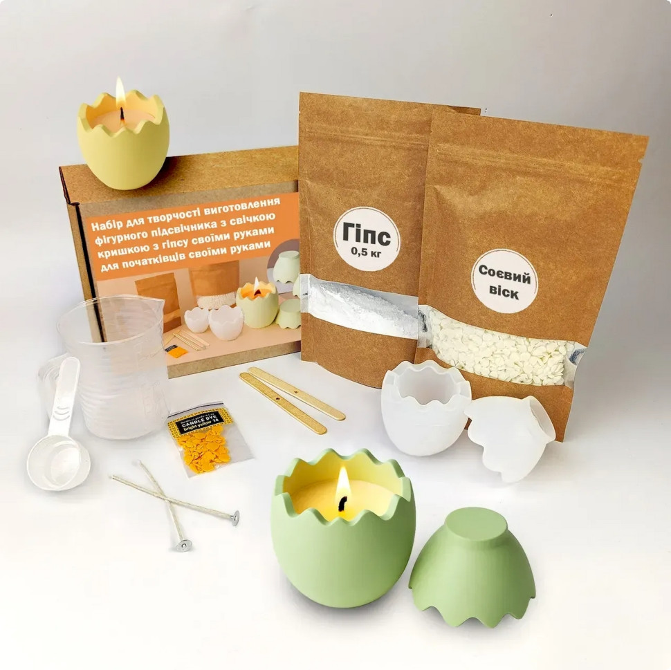 Создайте стильный фигурный подсвечник вместе с набором для творчества «Яйцо». Это отличный вариант для тех, кто хочет попробовать себя в декоративном литье и изготовить оригинальное изделие из гипса в домашних условиях. В наборе собрано все необходимое для творческого процесса, поэтому вы можете сразу приступить к работе.Готовый подсвечник станет красивым элементом декора, который придаст интерьеру уют или приятным подарком, сделанным собственноручно. Изделие можно оставить в натуральном виде или оформить по собственному вкусу.Состав набора:гипс скульптурный - 0,5 кгсиликоновая форма - 1 штмерный пластиковый стакан - 200 млмерный черпак для порошка - 70 млодноразовые перчатки - 1 парапалочки для смешивания - 4 штдеревянные держатели для фитиля — 2 шт.армированный фитиль с держателем — 2 шт.соевый контейнерный воск - 150 гвосковый краситель желтый - 1 шт.Инструкция по изготовлению:Подготовьте рабочее место и наденьте перчатки. В мерный стакан налейте чистую воду, постепенно добавьте гипс и тщательно перемешайте до однородной кремообразной консистенции без комочков. Осторожно вылейте смесь в силиконовую форму и слегка постучите по ней, чтобы убрать пузырьки воздуха. Оставьте изделие до полного отверждения примерно на 30-40 минут, после чего извлеките его из формы и дайте полностью высохнуть в течение 24 часов.После высыхания растопите соевый воск на водяной бане, разбавьте краситель и хорошо перемешайте. Установите фитиль в центре гипсового подсвечника и зафиксируйте его держателем. Аккуратно залейте растопленный воск в изделие и оставьте до полного застывания. В результате вы получите оригинальный подсвечник ручной работы для декора или подарка.