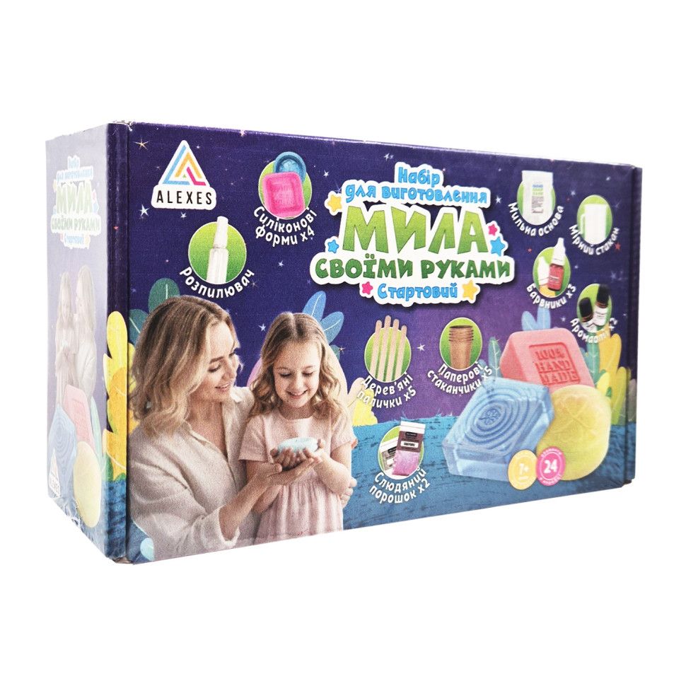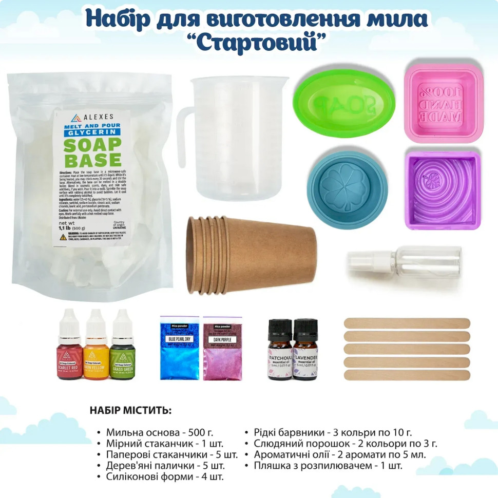 Набор для изготовления мыла "Стартовый"С этим набором для начинающих вы можете почувствовать себя настоящим мастером, создавая неповторимые подарки для себя и своих близких. Наш набор для изготовления мыла "Сделай сам" идеально подходит для тех, кто хочет найти для себя новое увлекательное хобби. Тщательно подобранные ингредиенты и подробная инструкция помогут вам как можно быстрее стать начинающим миловаром.Выберите аромат и цвет из набора, чтобы сделать мыло в соответствии с вашим вкусом и идеями, используйте материалы для декорирования, чтобы завершить ваше домашнее мыло и сделать его еще более уникальным.Каждый ингредиент этого набора был подобран с заботой об удобстве клиента.Набор может стать отличным подарком, а процесс изготовления мыла - увлекательным занятием для всей семьи.Набор содержит:1. Органическая мыльная основа 500 гр;2. Мерный стаканчик для растопки мыльного основания - 1 шт;3. Деревянные палочки - (5 шт.);4. Многоразовые силиконовые формочки - (4 шт.);5. Жидкие красители - 3 шт по 10 гр (лимонно-желтый, травяной зеленый, красный);6. Слюдяной порошок - 2 шт по 3 гр (сиреневый, голубой);7. Бутылка с распылителем - 1 шт;8. Бумажные стаканчики - 5 шт;9. Ароматические масла - 2 шт по 5 мл (Пачули, лаванда).ИнструкцияШаг 1: Подготовка рабочего местаУбедитесь, что ваше рабочее место чисто и удобно для работы. Защитите поверхность газетами или бумагой.Шаг 2: Растопка мыльной основыИзмерьте необходимое количество органического мыльного основания с помощью мерного стаканчика. Растопите мыльное основание в микроволновке или водяной бане до полного растворения. Периодически помешивайте до равномерной жидкой структуры мыла.Шаг 3: Добавление красителей и ароматизаторовДобавьте жидкие красители, ароматизаторы или слюдяной порошок к растопленному мыльному основанию, чтобы получить желаемый цвет и аромат. Можете экспериментировать с разными комбинациями цветов.Шаг 4: Наполнение формПодготовьте формочки, разместив их на рабочей поверхности. Начните заливать растопленное мыльное основание в формы.Шаг 5: ЗастываниеДайте милой пару часов, чтобы оно затвердело.Шаг 6: Извлечение мыла из формПосле застывания, осторожно извлеките мыло из форм.Шаг 7: Хранение и дарениеГотовое мыло следует хранить в прохладном сухом месте. При желании, используйте упаковочные мешочки из органзы для создания великолепного подарка вашим близким.Готово! Теперь ваши дети могут наслаждаться своими собственноручно созданными мылами или подарить их близким и друзьям. Наслаждайтесь творчеством!