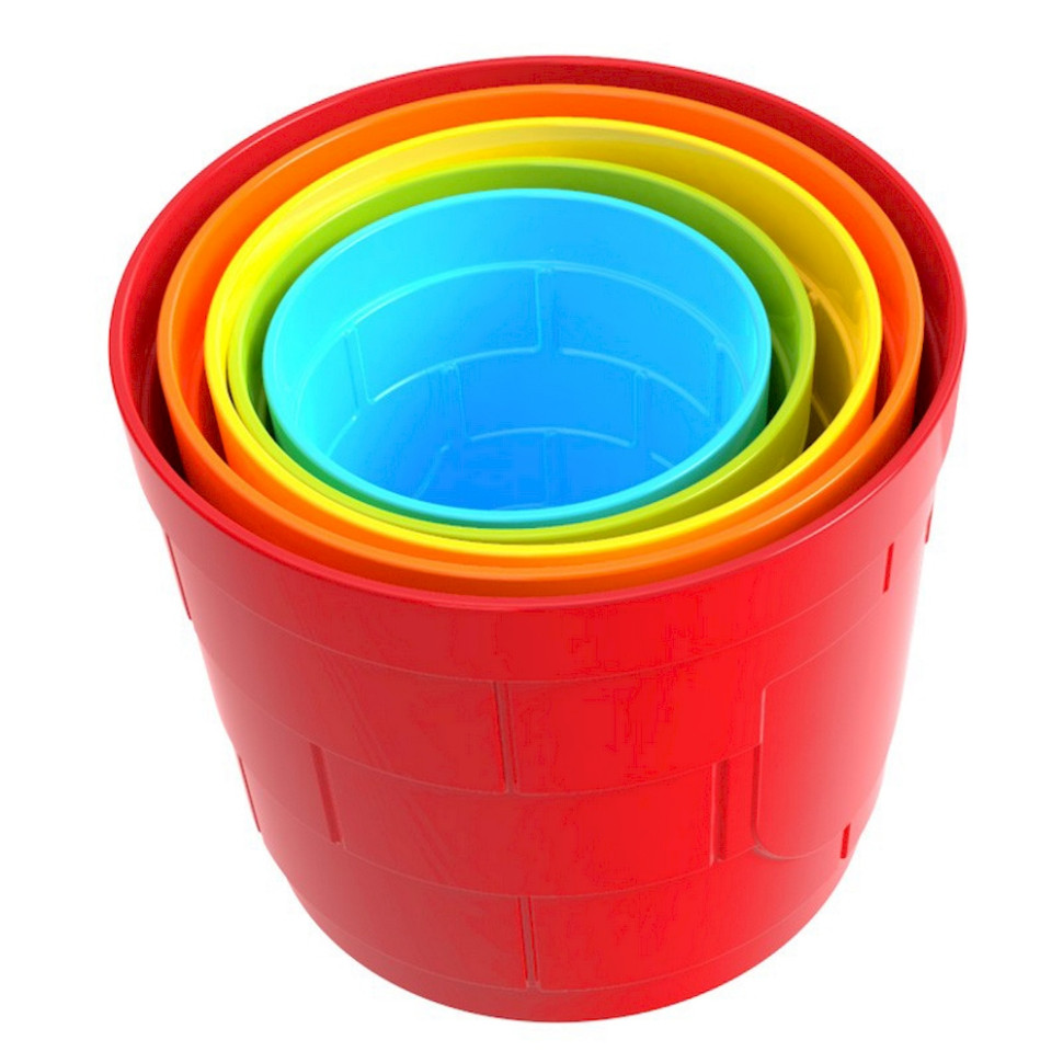 Пирамидка состоит из пяти элементов разных цветов и размеров. Рельеф и форма элементов пирамидки имитируют вышки средневекового замка - с окнами, дверями и каменной кладкой.Пирамидка - это простая и одновременно обучающая игрушка. С ней интересно играть дома и на улице в песочнице. Благодаря разным размерам элементов можно собрать пирамиду от большего элемента к меньшему, или наоборот, сложить все в наибольшее. В песочнице элементы пирамидок удобно использовать как формочки для песка и формировать куличики в разной последовательности.С такими играми ребенок изучает цвета, размеры и формы, делает первые шаги в счете.