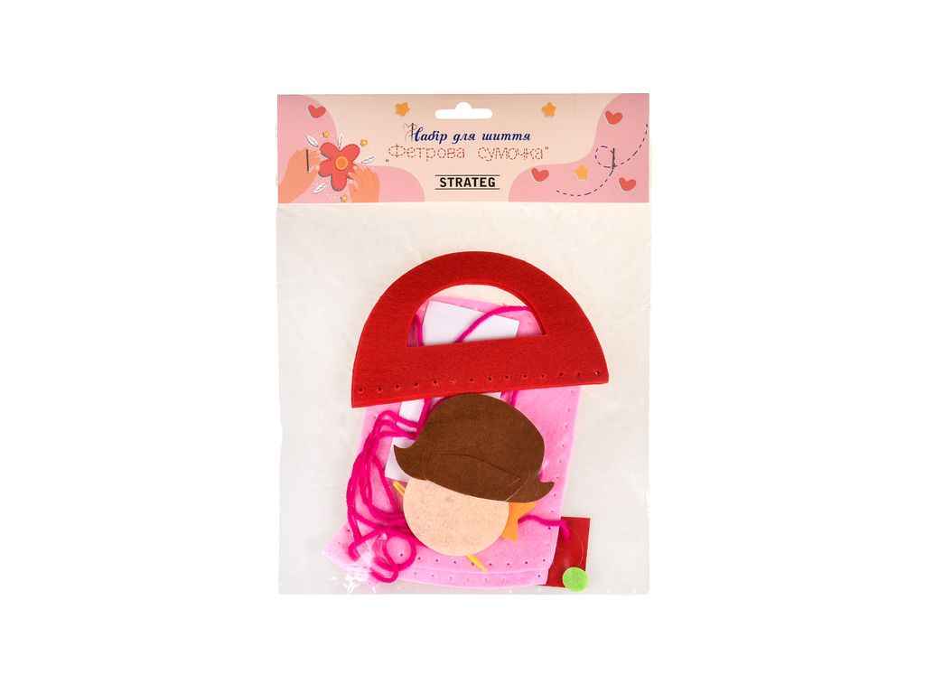 Комплектація: фетрова основа для сумки, елементи з фетру, декоративні елементи, нитки, пластикова голка.