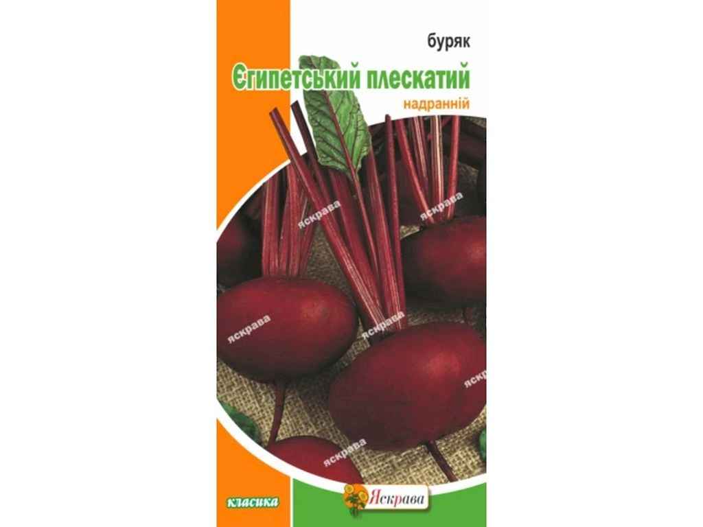 Буряк Єгипетський плоский — середньоранній сорт. Червоно-фіолетові плоди мають приплющену форму і масу до 500 г.,буряк Єгипетський стійкий до перепадів температур і дає стабільні врожаї до 5-7 кг/м.кв. Терміни дозрівання—110-120 днів,плоди плоскі, до 13 см у висоту.Перед посадкою можна замочити насіння на 1-2 доби, міняючи за цей час воду 2-3 рази