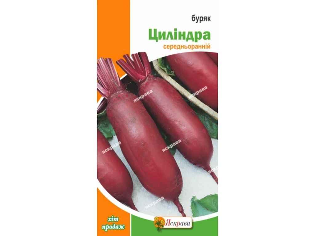 Буряк Циліндра-пізньостиглий сорт.Приємний солодкуватий смак подовжених плодів ідеально підходить для приготування перших страв, салатів, навіть соків і солодощів. До того ж Циліндра відрізняється підвищеною врожайністю. З одного квадратного метра городу збирають від 8 до 10 кг буряка, що є найвищим показником.Терміни дозрівання: для свіжої пучкової продукції—75-80 днів, для зберігання—120-130 днів,коренеплоди вирівняні, довжиною до 20 см, діаметром 6-9 см, масою 200-550 г.мякоть дуже соковита, солодкувата, швидко готується, універсального застосування.Сіють із квітня по травень, після відходу заморозків, на глибину до 3-4 см,сходи очікуються через 5-7 днів, при температурі від 10 градусів.