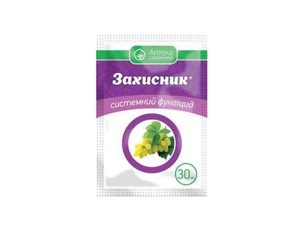 ЗАХИСНИК Фунгіцид контактно-системний захисної та терапевтичної дії проти широкого спектру хвороб рослин.- унікально поєднує профілактичні, лікувальні та викорінюючі властивості; - швидка і водночас подовжена стабільна захисна дія (понад 3 тижні); - контролює одночасно широкий комплекс хвороб рослин; - швидкий «стоп-ефект» — зупиняє розвиток хвороби відразу після обробки; з- авдяки подовженому ефекту дії досягається значна економія коштів.Діюча речовина: тіофанат-метил, 500 г/л.Препаративна форма: концентрат суспензії.Застосування: Перед проведенням обприскування необхідно розрахункову кількість препаратурозчинити у чистій воді та ретельно перемішати. Робочий розчин використати в день його приготування, оскільки при довготривалому зберіганні втрачаються властивості препарату, що призводить до зниження ефективності дії проти хвороб. Обробку проводити за сприятливих погодних умов (відсутність поривчастого вітру, температура повітря не вище 250С), зазвичай це ранкові (до 10-11) та вечірні (18-22) години. Під час обприскування необхідно забезпечити рівномірне покриття рослин листків та стебел розчином без стікання з обробленої поверхні.Доцільним є використання в суміші з інсектицидами ПІРІМІВІТ, АНТИКЛІЩ ПРО та мікродобривом АВАНГАРД ОВОЧЕВІ на овочевих культурах або АВАНГАРД ПЛОДОВО-ЯГІДНІ на плодових насадженнях.Максимальна кратність обробок за сезон – 3. Інтервал між обробками складає 10-14 днів в залежності від погодних умов та інфекційного фону. Строк виходу людей на оброблені площі для проведення ручних робіт – 7 днів, механізованих робіт – 3 доби. Упаковка: 30 мл.