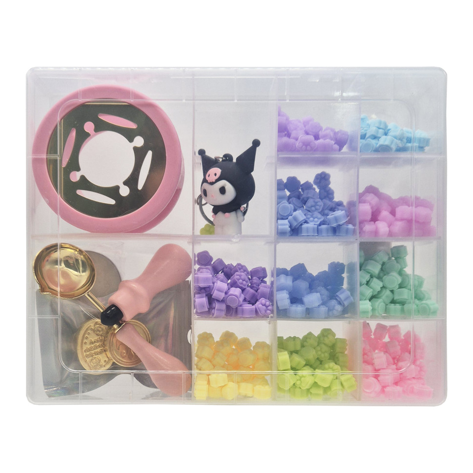 Все элементы удобно размещены в крепком пластиковом боксе, что обеспечивает порядок, легкое хранение и комфортную транспортировку. В комплект входит все необходимое для работы: парафиновая свеча для нагрева, ложечка для плавления воска, подставка для нагрева и металлическая печать с изящными сменными насадками, позволяющими создавать различные варианты отпечатков.