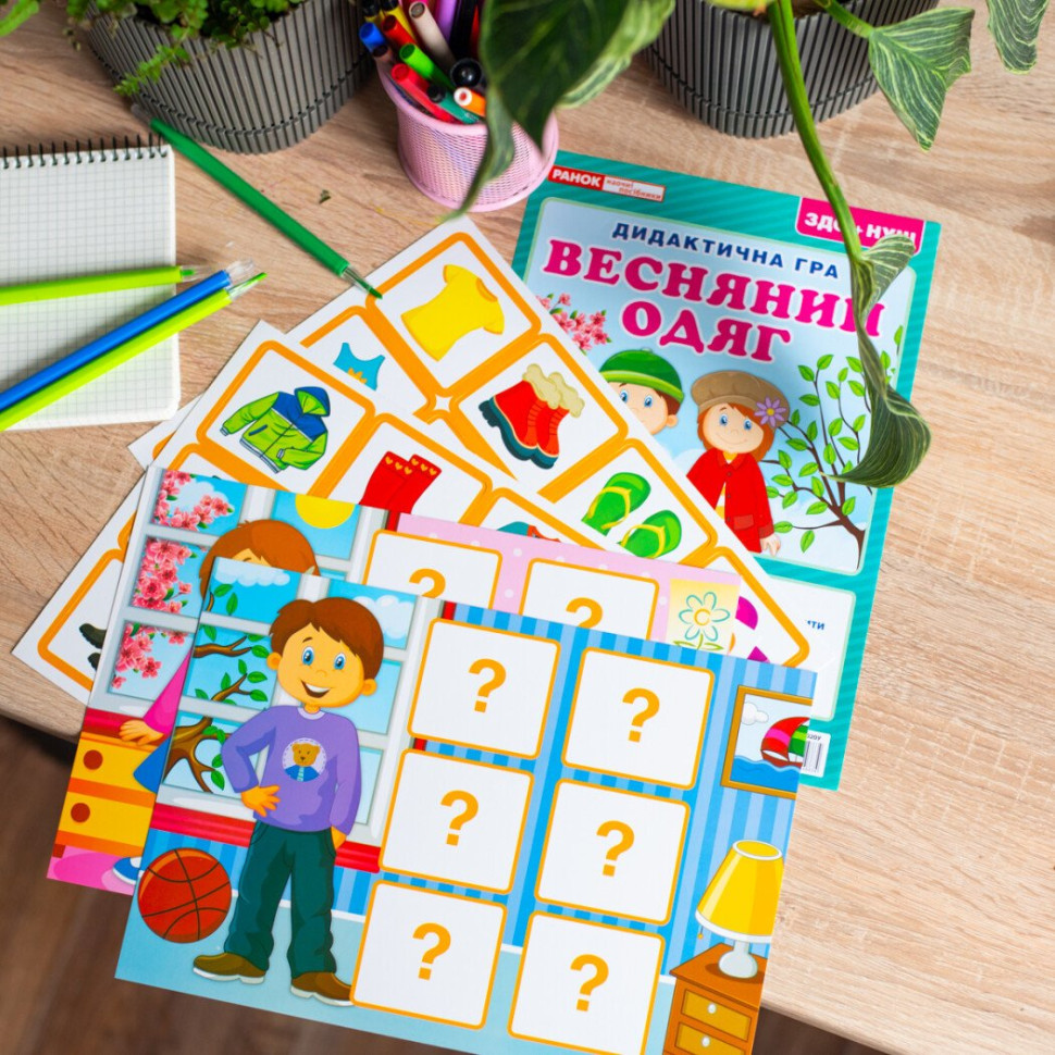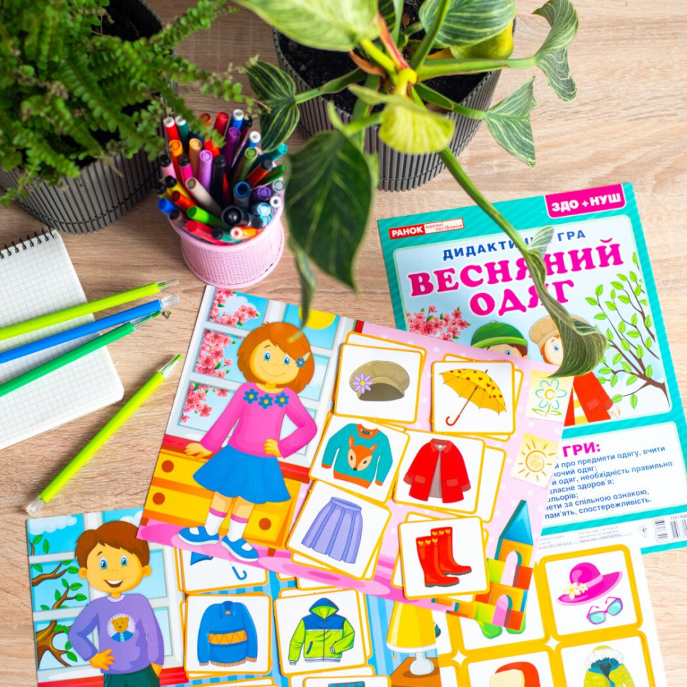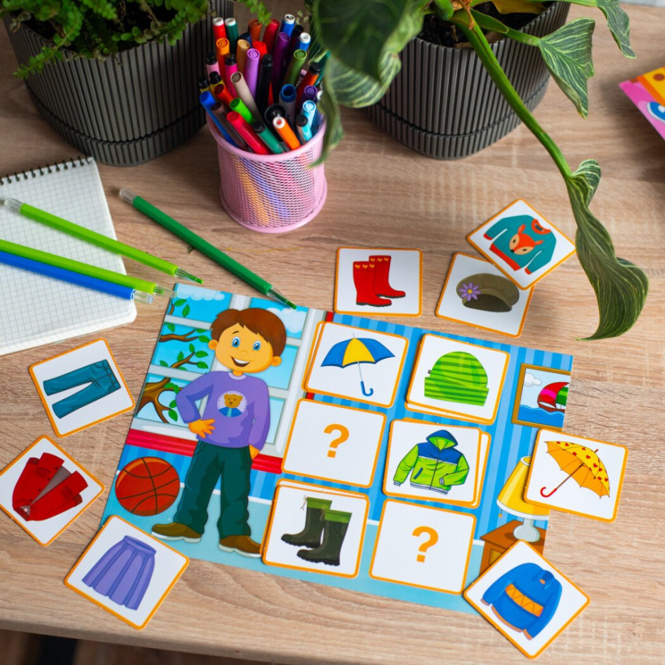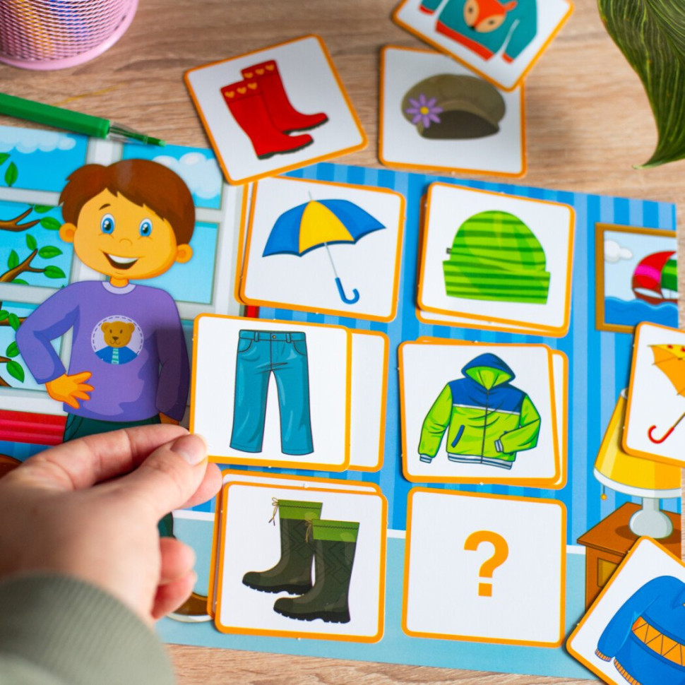 Учим детей правильно одеваться и заботиться о своем здоровье через игру. Дидактический материал разработан для использования во время тематических недель, посвященных весне. Игра подойдет как для групповой работы, так и для занятий с ребенком на дому. В наборе 2 поля для игры (формат 30х21 см) с глянцевой поверхностью, 24 карты с одеждой и аксессуарами и рекомендации и загадки.