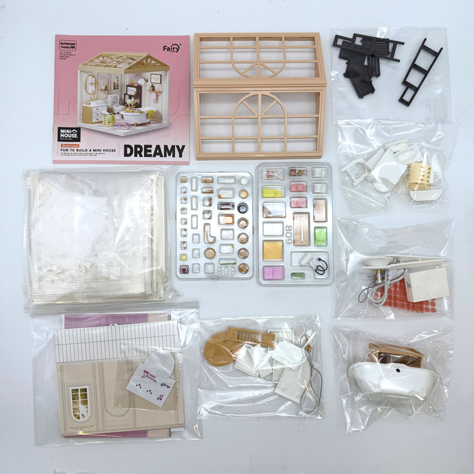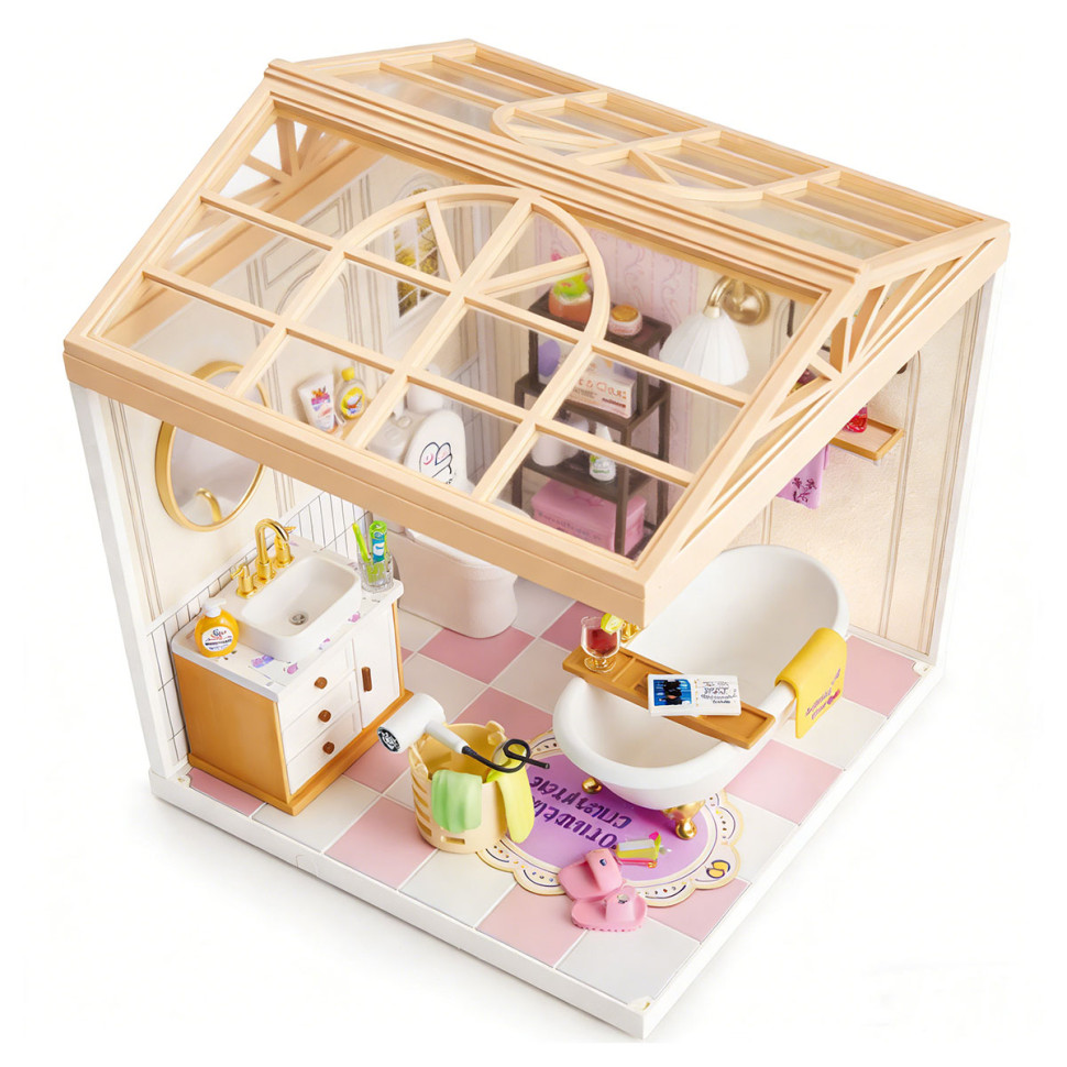 В наборе воспроизведена игрушечная ванна с сантехникой, мебелью для хранения и декоративными аксессуарами. Детали интерьера – ванна, умывальник, зеркало, полочки и мелкие бытовые элементы – формируют целостное пространство с ощущением чистоты и комфорта. Встроенное освещение с питанием от кабеля USB подчеркивает глубину пространства и делает композицию более выразительной.