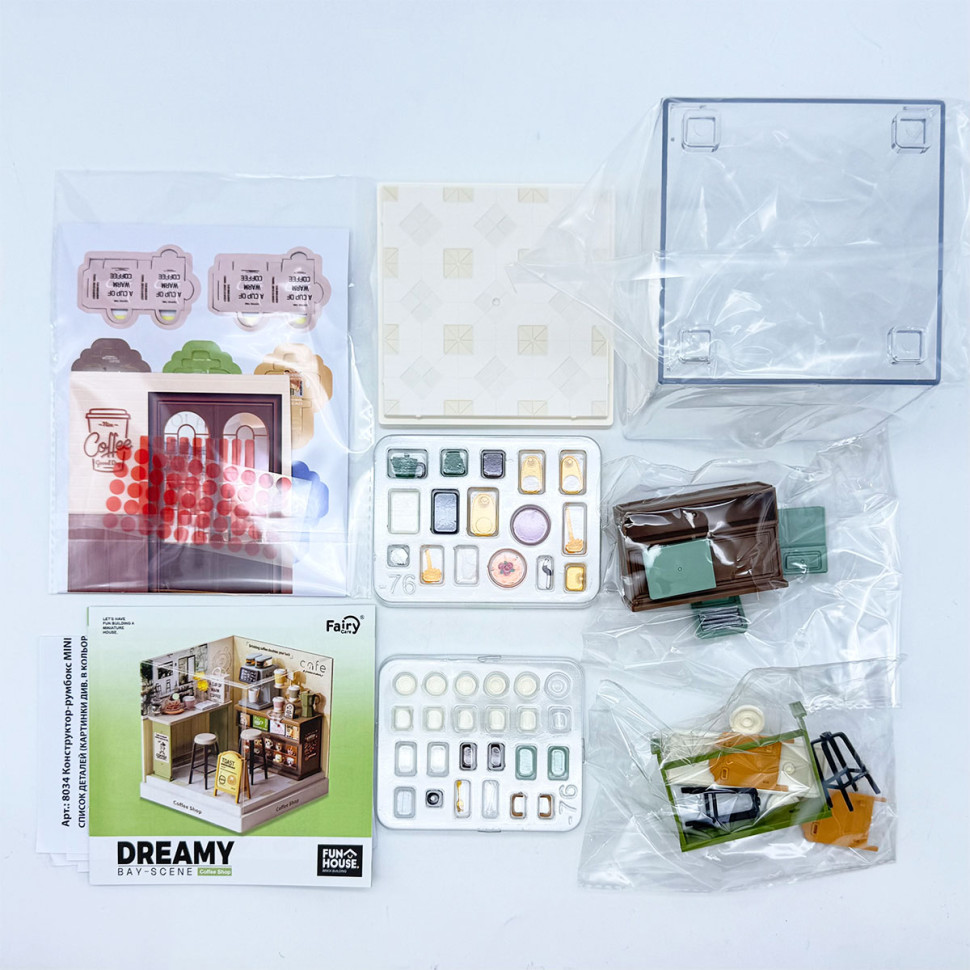 В наборе воссоздана атмосфера уютной игрушечной кофейни с прилавком, кофейной зоной, полками и декоративными элементами. Миниатюрная кофемашина, чашки, банки с напитками, меню и аксессуары формируют узнаваемое пространство, ассоциирующееся с кофейным настроением. Прозрачный бокс позволяет рассматривать интерьер как коллекционный объект или элемент декора.