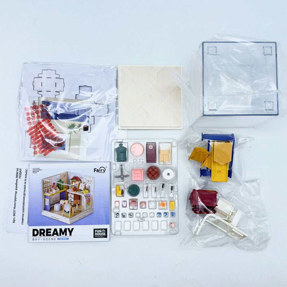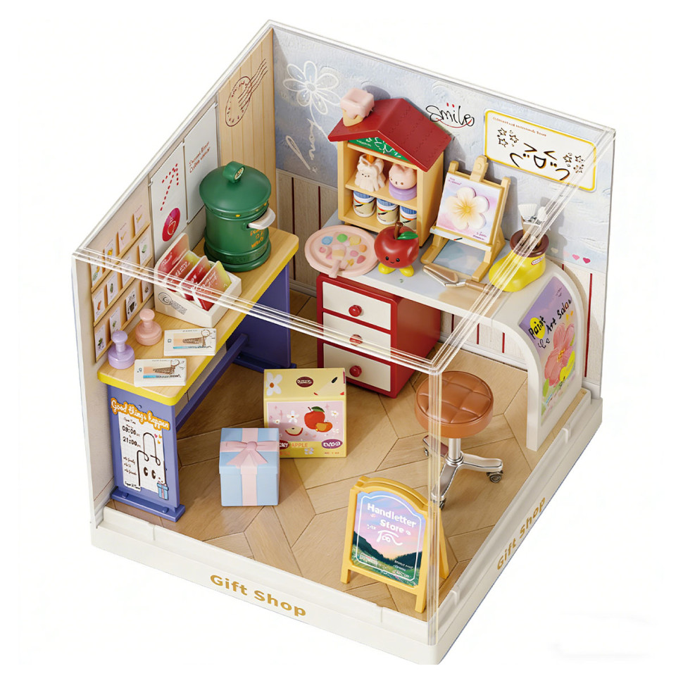 Конструктор-румбокс MINI HOUSE серии 'Интерьер Мини' – МАГАЗИН ПОДАРКОВ – набор для самостоятельной сборки миниатюрного интерьера магазина подарков в прозрачном боксе. Поэтапно соберите элементы конструктора, сформируйте торговое пространство и разместите детали внутри бокса, создав завершенную минисцену!