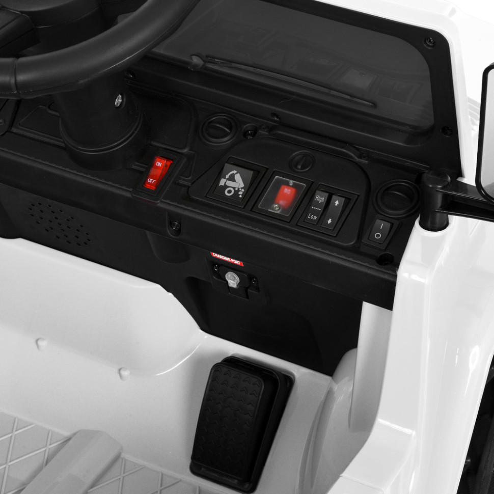 Электромобиль оснащен двумя двигателями, обеспечивающими уверенное движение и стабильную скорость. Плавный старт позволяет избежать резких рывков, делая поездку более безопасной. Управление возможно как в ручном режиме, так и дистанционно с помощью пульта с кнопкой экстренной остановки. Предусмотрен отдельный переключатель для переключения режимов управления.