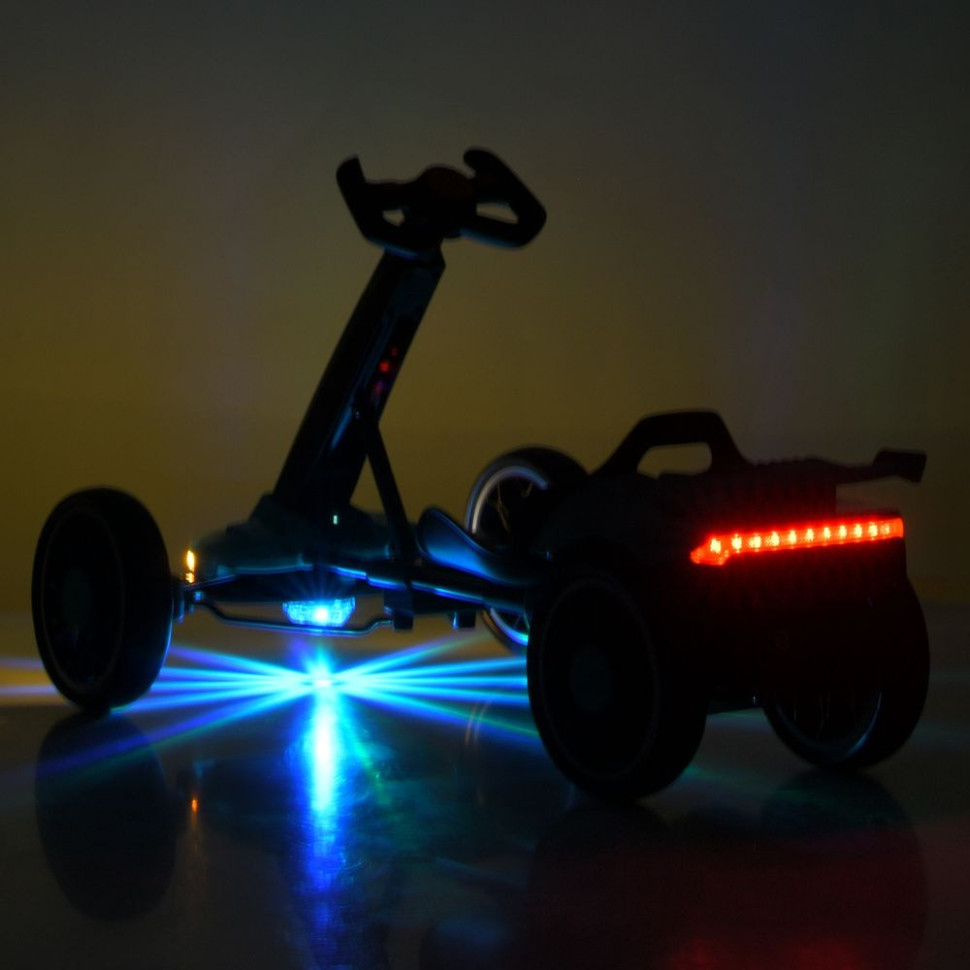 Электрокарт оснащен двумя моторами, обеспечивающими стабильное движение с максимальной скоростью до 5 км/ч. Управление осуществляется с помощью ручки газа на руле и кнопки переключения движения вперед/назад. Также предусмотрен пульт дистанционного управления.