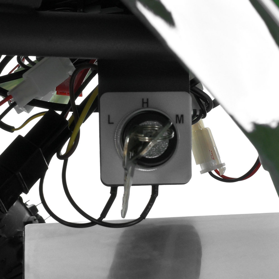 Модель оснащена мощным электродвигателем на 1000W, что позволяет развивать скорость до 25 км/ч. Предусмотрены три скоростных режима с возможностью переключения, что позволяет адаптировать поездку под уровень подготовки ребенка. Запуск осуществляется поворотом ключа, управление – с помощью ручки газа и тумблера движения вперед/назад.