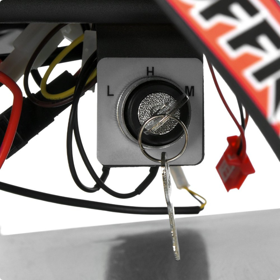 Модель оснащена мощным электродвигателем на 1000W, что позволяет развивать скорость до 25 км/ч. Предусмотрены три скоростных режима с возможностью переключения, что позволяет адаптировать поездку под уровень подготовки ребенка. Запуск осуществляется поворотом ключа, управление – с помощью ручки газа и тумблера движения вперед/назад.