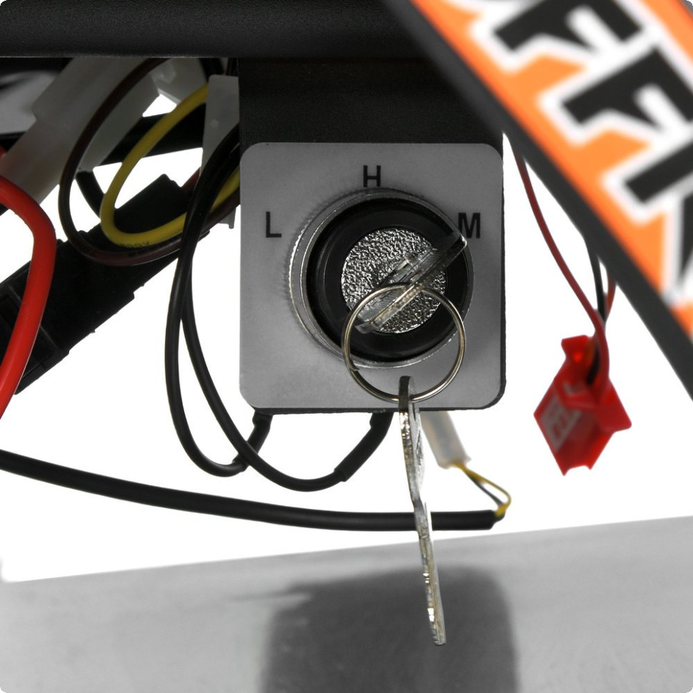 Модель оснащена мощным электродвигателем на 1000W, что позволяет развивать скорость до 25 км/ч. Предусмотрены три скоростных режима с возможностью переключения, что позволяет адаптировать поездку под уровень подготовки ребенка. Запуск осуществляется поворотом ключа, управление – с помощью ручки газа и тумблера движения вперед/назад.