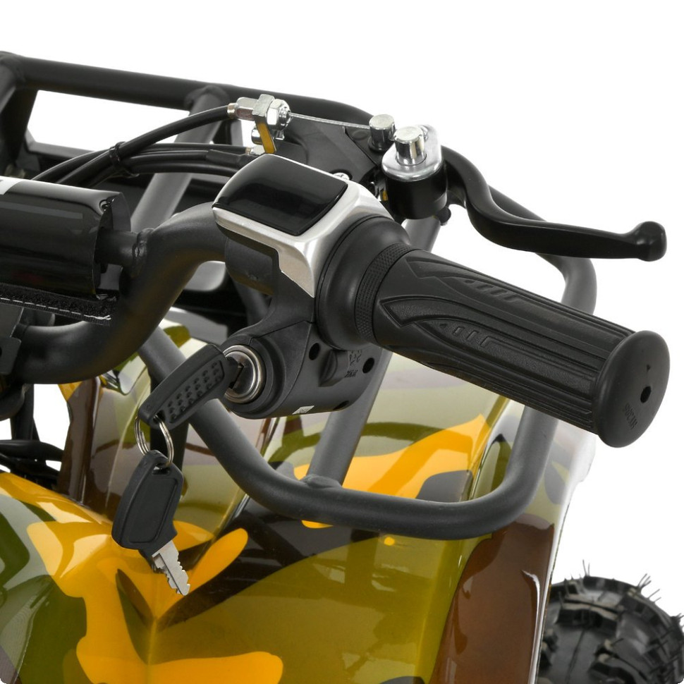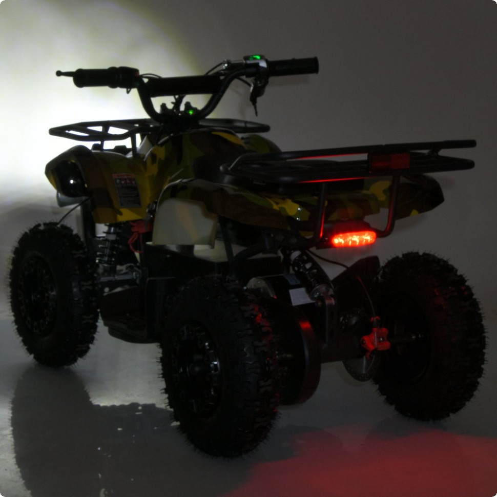 Квадроцикл оборудован надувными резиновыми колесами, обеспечивающими хорошее сцепление с поверхностью. Передние и задние амортизаторы с регулировкой жесткости эффективно смягчают неровность дороги. Дисковый тормоз спереди и сзади гарантирует надежное торможение, а цепная передача обеспечивает передачу мощности от двигателя.