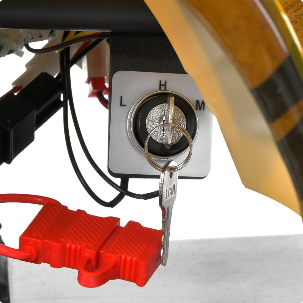Модель оснащена электродвигателем мощностью 1000W, позволяющим развивать скорость до 23 км/ч. Предусмотрены три скоростных режима с возможностью переключения, что позволяет выбрать оптимальный темп движения. Запуск производится поворотом ключа, управления – ручкой газа и тумблером для движения вперед и назад.