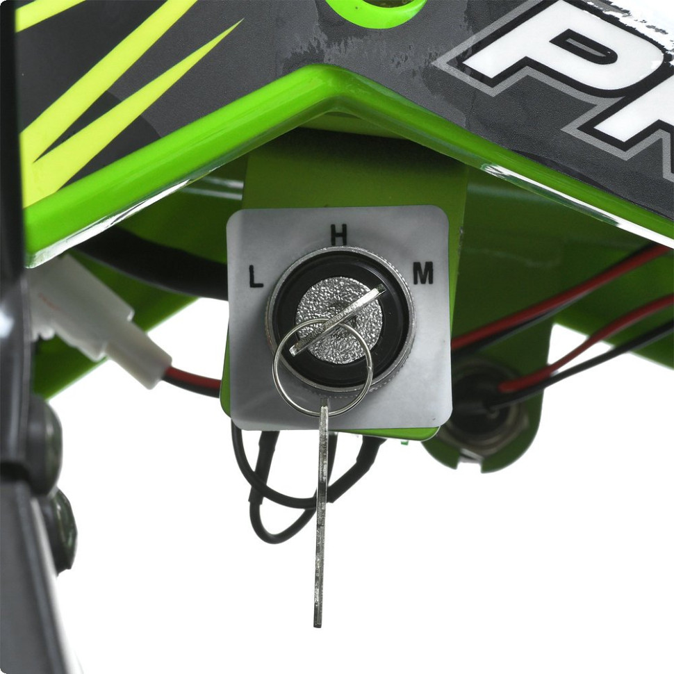 Модель оснащена двигателем мощностью 1200W и аккумуляторной системой на 48V, что позволяет развивать скорость до 25 км/ч. Предусмотрены три скоростных режима, переключаемых ключом под корпусом. Запуск осуществляется поворотом ключа, управление – с помощью ручки газа и тумблера движения вперед/назад.