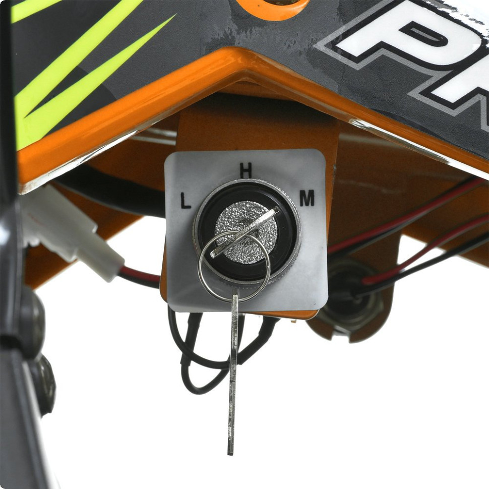 Модель оснащена двигателем мощностью 1200W и аккумуляторной системой на 48V, что позволяет развивать скорость до 25 км/ч. Предусмотрены три скоростных режима, переключаемых ключом под корпусом. Запуск осуществляется поворотом ключа, управление – с помощью ручки газа и тумблера движения вперед/назад.