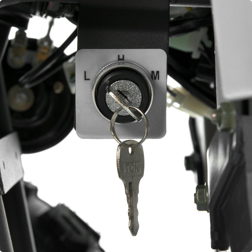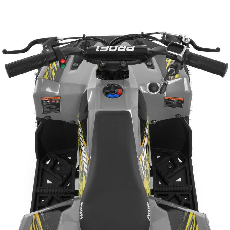 Квадроцикл оснащен двигателем мощностью 1000W и аккумуляторной системой на 36V, что позволяет развивать скорость до 25 км/ч. Предусмотрены три скоростных режима, переключаемых ключом под корпусом. Запуск производится поворотом ключа, управления – ручкой газа и тумблером для движения вперед и назад.