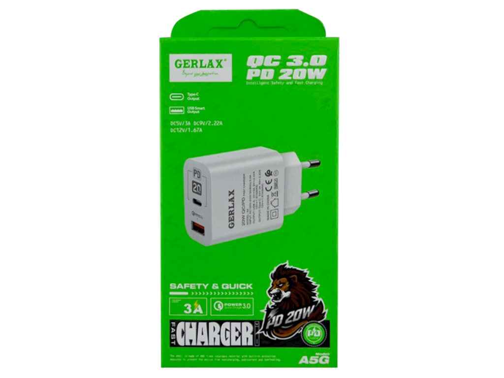 Мережевий зарядний пристрій USB A5G 3A 20W PD QC3.0 білий ТМ Gerlax