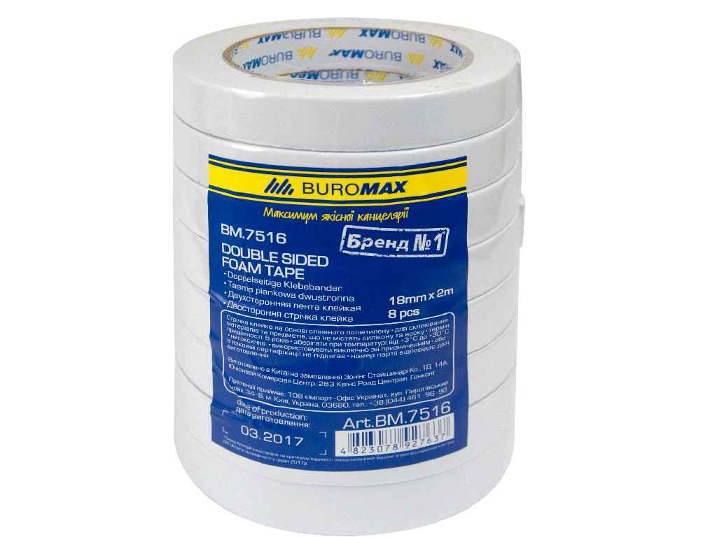 Клейка стрічка двохстороння на пінній основі 18мм х 2м. BM.7516 8шт./уп. ТМ BUROMAX
