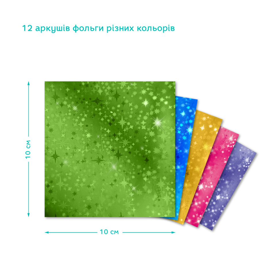 Комплектация: 12 разноцветных листов фольги (10 на 10 см) и 4 магнита (10 на 7 см).