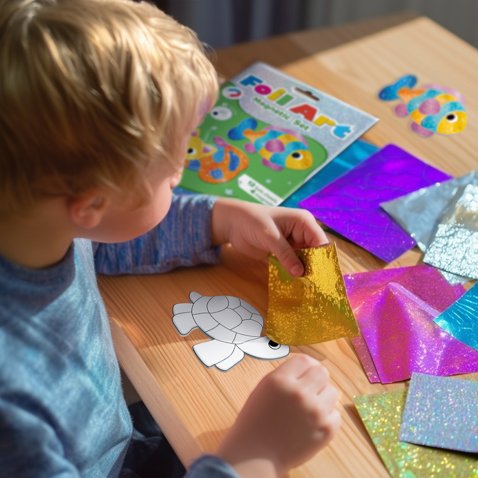 Этот набор обеспечивает творческую деятельность без грязи, идеально подходящей для использования дома или в путешествии. Просто снимите защитный слой с магнита, приложите фольгу, нажмите – и готово, изображение засияет металлическим блеском.