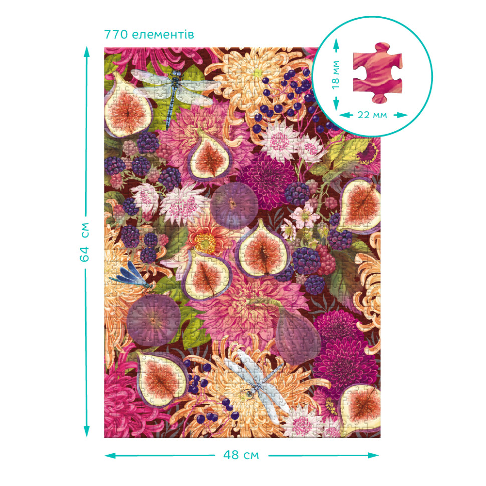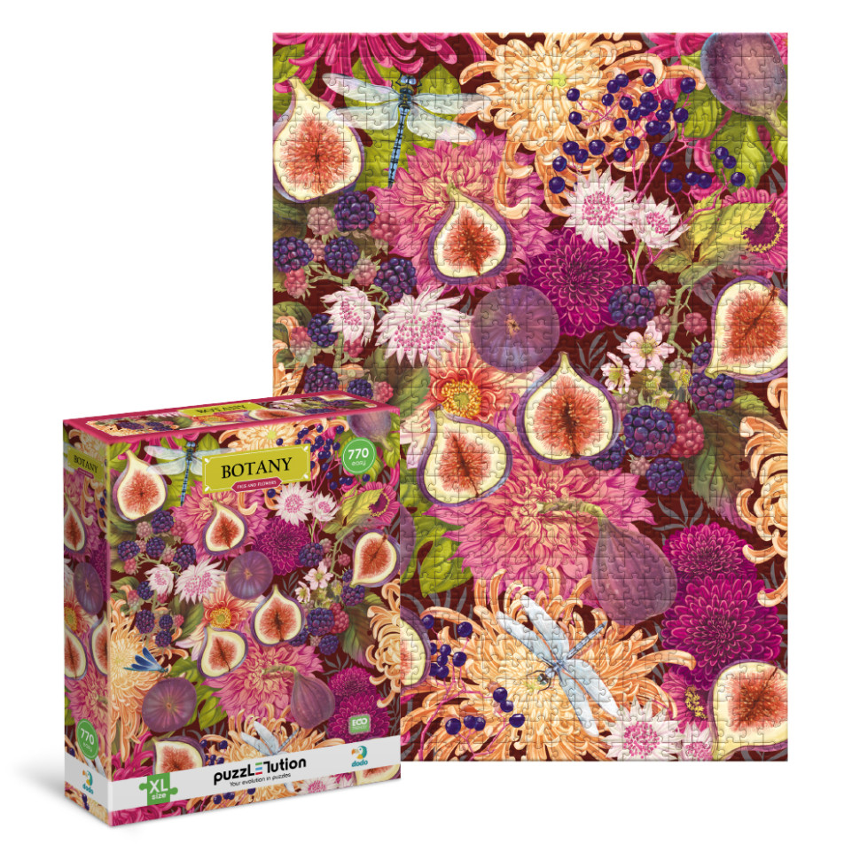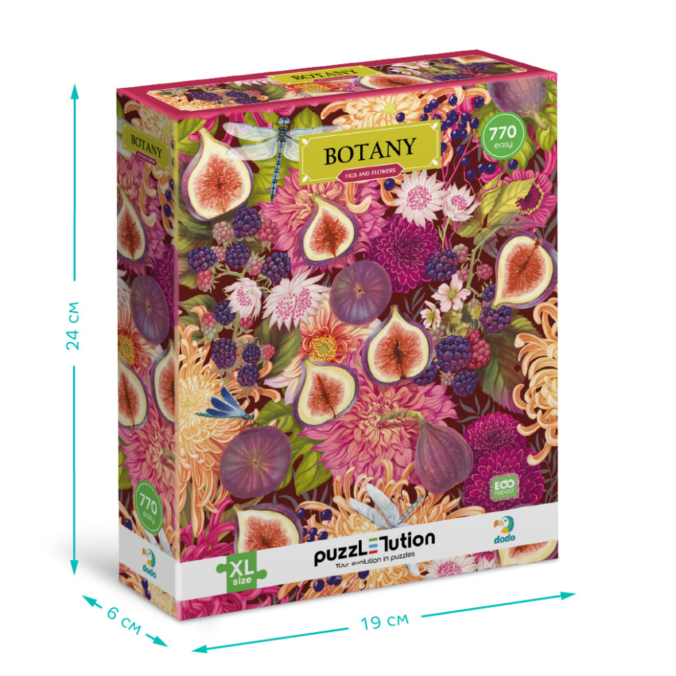 Наслаждайтесь гармонией природы с уникальным пазлом Dodo Botany. Иллюстрация наполнена сочными плодами инжира, цветами и яркими деталями, создающими впечатление настоящей ботанической коллекции.