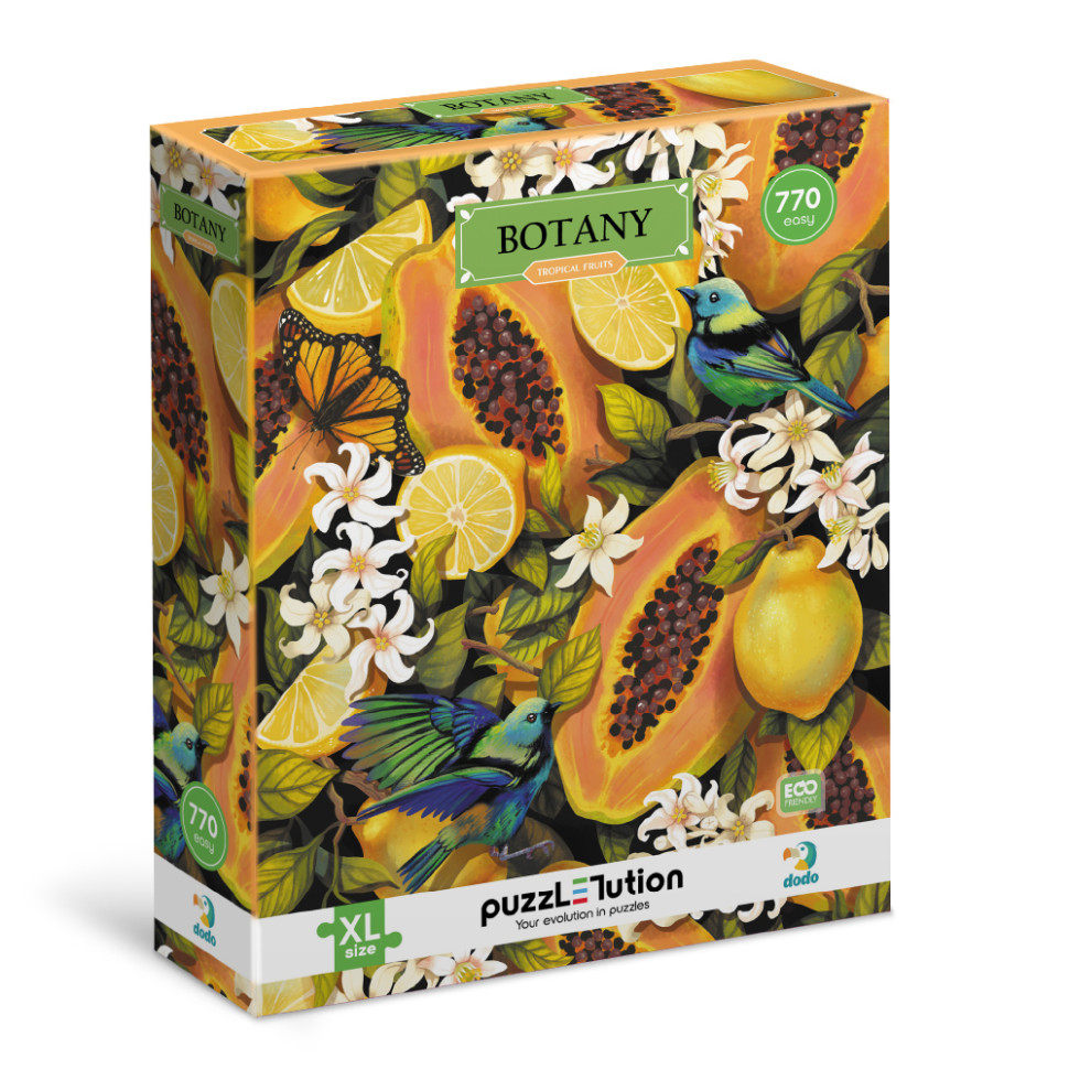 Погрузитесь в мир ярких красок и экзотики с пазлом Dodo Botany "Тропические фрукты". Сочные папаи, лимоны, цветущие ветки и птички создают неповторимую атмосферу летнего сада, наполненного жизнью и свежестью.