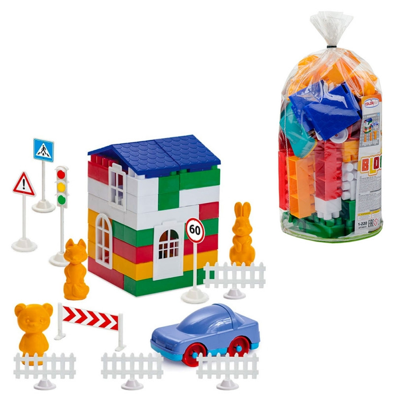 Конструктор "Лидер" №2 (80 дет.) - большой набор, состоящий из разноцветных блоков, соединяющихся между собой по принципу "шип-паз", а также дополнительных элементов, таких как оконные блоки, элементы крыши, маленькие заборчики, уличные знаки дорожного движения, машинка и даже симпатичные миниатюрные фигурки зверюшек (жителей будущего городка).Такое разнообразие "строительных материалов" позволит ребенку сконструировать дома любой формы и сложности. Яркие цвета деталей обязательно привлекут малышей, а увлекательный и позитивный процесс строительства надолго займет внимание. Собирая конструктор, дети осваивают новые для себя навыки, тренируют мелкую моторику рук, учатся фантазировать, получают базовые представления о форме и размере окружающих предметов.Следует упомянуть, что конструктор изготовлен из качественного пластика, без вредных для здоровья примесей, совершенно безопасного для здоровья ребенка. За пластиковыми блоками легко ухаживать: они легко очищаются от загрязнений теплой водой с нейтральными моющими средствами.В комплекте: 80 деталей.